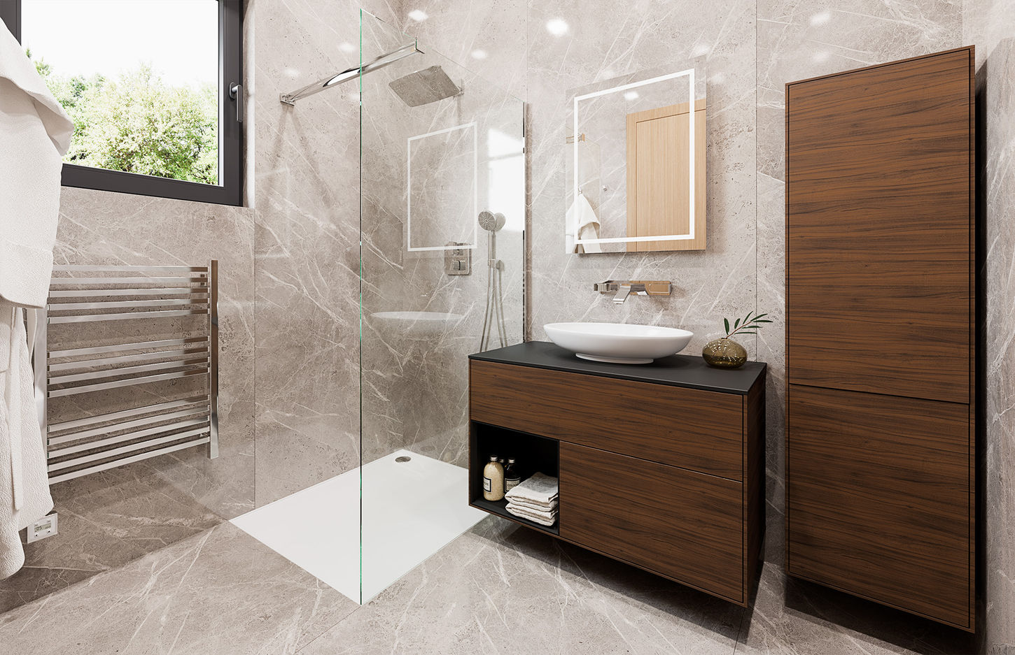 V návrhu boli použité veľkoformátové keramické obklady v imitácii mramoru, kvalitný nábytok talianskych značiek a dizajnové svietidlá. Podmienkou bolo vyhnúť sa stolárskym výrobkom.